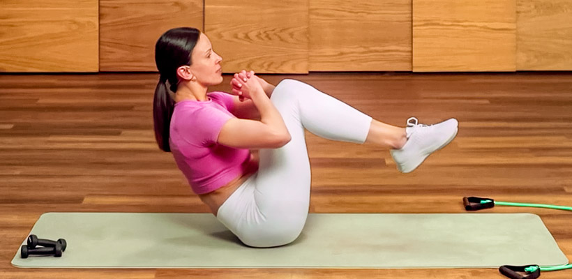 Тонкий коврик для йоги или пилатеса. Он должен хорошо фиксироваться на полу и не деформироваться при нагрузках.